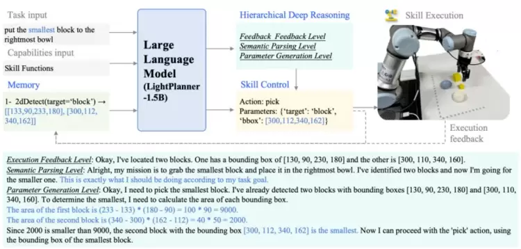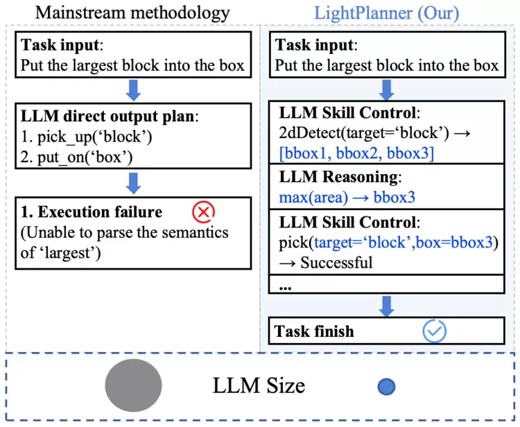 传统大语言模型(LLM)在具身任务中展现了强大的语义理解能力,但其庞大的参数规模难以在边缘设备上高效运行。轻量级模型虽解决了算力限制,却因缺乏复杂推理能力,如在 “抓取最大积木” 等需动态逻辑判断的任务中表现乏力。这一“推理能力瓶颈”已成为制约轻量级具身智能系统规模化应用的核心障碍。