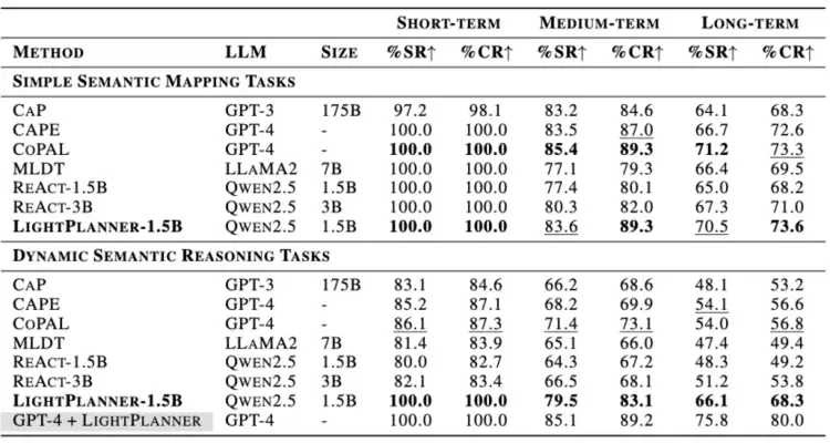 我们基于LightPlan-40K数据集训练了LightPlanner模型。实验结果显示,在真实世界环境中的具身决策规划任务中,尽管LightPlanner的参数数量最少,仅为1.5B,但其任务成功率最高。在需要空间语义推理的任务中,其成功率比ReAct高出14.9%。此外,实验还展示了LightPlanner在边缘设备上的运行潜力,突显其在资源受限环境中的适用性。