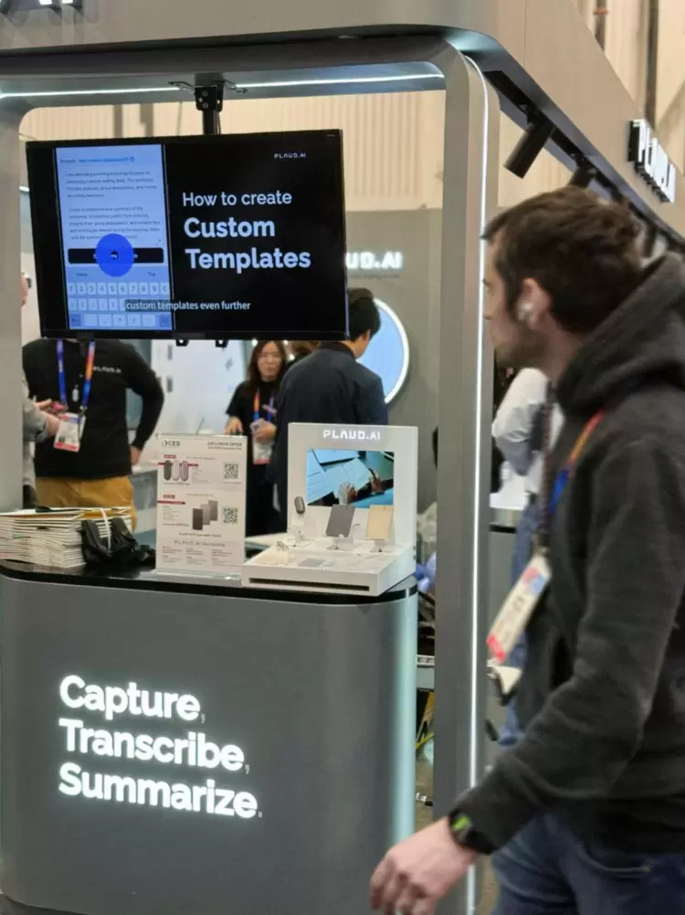 以今年的美国CES展为例,当PLAUD.AI试图向全球用户传递"将对话转化为可操作数据"的AI技术愿景时,inDare通过极简弧形结构与互动体验模块的有机结合,将抽象的技术概念具象化为可触达的感官体验。展台设计融合简洁现代的结构与互动体验,采用弧形结构、开放式布局及明亮灯光系统,避免信息过载,精准传递品牌核心价值。inDare延续PLAUD.AI专属设计语言,利用模块化展示和创意化陈列方式,突出了产品多样性和技术优势。
