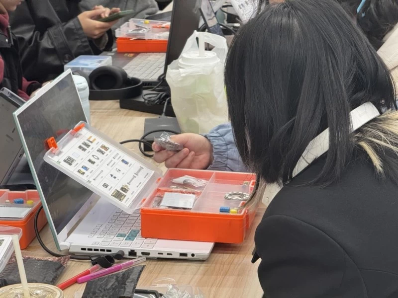 徐千千通过“信息科技基础教学套件”中的光敏、声音、触摸传感器,演示如何将环境数据转化为动态视觉与音效,并强调:“传感器是艺术装置的‘感官’,它让作品能‘听见’观众的脚步、‘感知’空间的光影变化,从而建立人与作品的深度对话。”