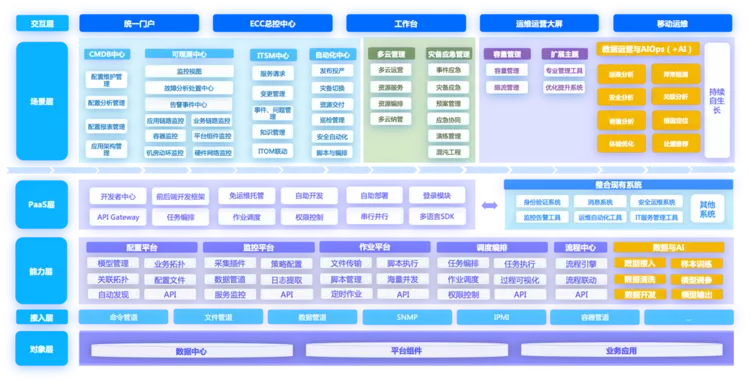 平台化底座:以iPaaS和aPaaS为核心,通过能力隔离、统一治理和持续发展,提供灵活、高效的运维场景构建与管理能力,满足企业不断变化的运维需求;