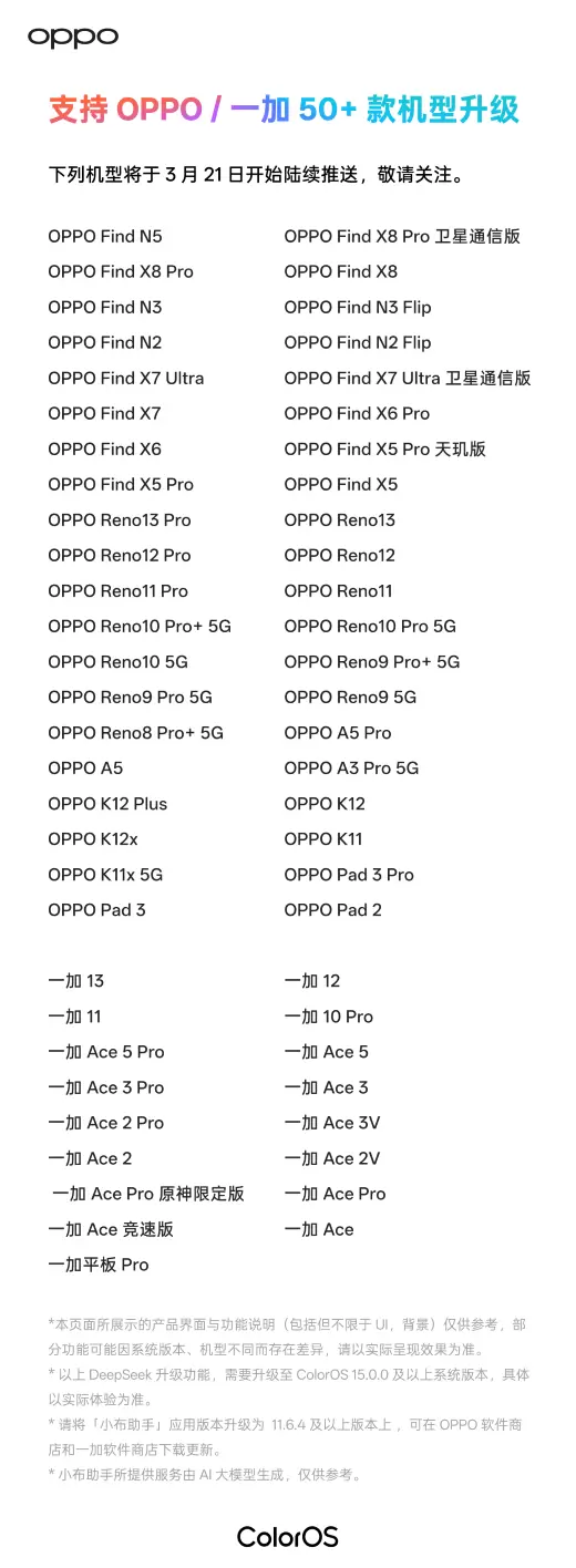 此次 ColorOS全新升级的DeepSeek联网深度识图识文档功能,已覆盖OPPO全线产品,包括Find系列、Reno系列、A系列、K系列、IoT平板及一加品牌在内总计50余款机型。适配升级3月21日已完成覆盖,更多机型适配计划请持续关注 ColorOS 官方信息。