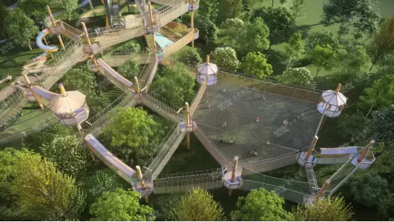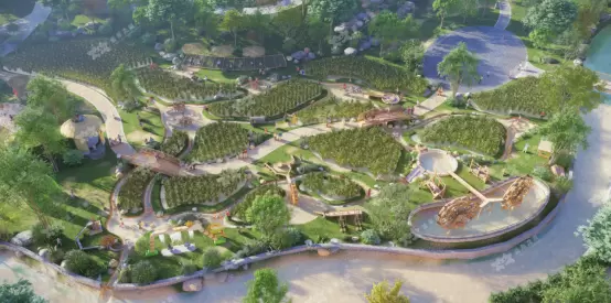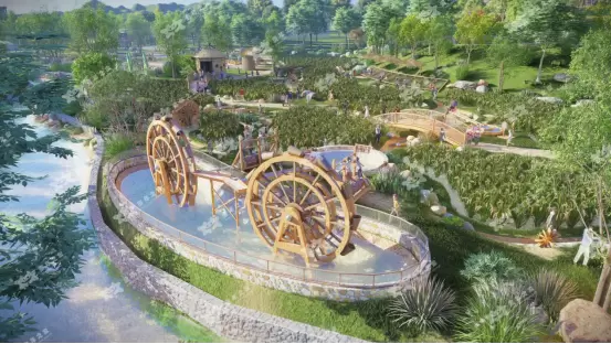 项目以“种子”为主题,运用“灌溉”这一统一且具有连续性的设计语言串联场地,利用地形的高低差异,设计不同层次的灌溉系统,如从高处引水,通过水渠、水槽等装置,让水流自然流到低处,模拟真实的灌溉过程,让孩子们游玩中了解农耕文化。同时,场地内特别规划了丛林拓展区,配备符合中大龄儿童及成人使用需求的设施,为不同年龄层的游客提供丰富的活动体验。