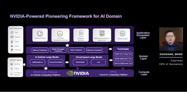 该框架包括三层,首先是最下面的算力层,它是依托NVIDIA车端计算平台DRIVE AGX及云端AI计算平台共同打造的强大算力引擎;中间是系统层,它包括以多模态和端到端为核心的车端大模型,和以世界模型和大语言模型为核心的云端大模型。