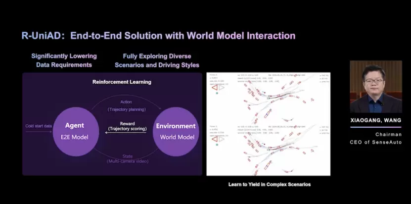 此外,随着近期基于强化学习的大模型训练的思路得到验证,绝影创造性地提出了“与世界模型协同交互的端到端技术路线R-UniAD”。通过“开悟”世界模型生成在线交互的仿真环境,以此进行端到端模型的强化学习训练。基于该范式可以大幅降低端到端模型训练的数据门槛,并在充分探索各种可能性的基础上有望实现远超人类的驾驶表现。