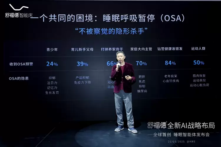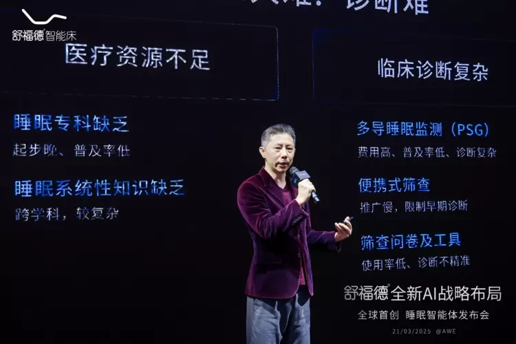 3月21日世界睡眠日,在2025 AWE全球家电及消费电子行业的年度盛会上,舒福德智能床聚焦睡眠呼吸暂停这一公众社会现象,携《2025睡眠白皮书》重磅发布全球首创睡眠智能体——AI小舒,再次引发了全球业界对未来智能睡眠的全新思考。