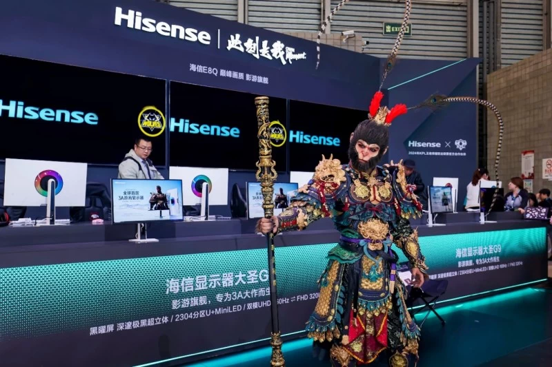作为《黑神话:悟空》官方合作显示器,海信大圣G9在活动现场携手悟空COSER打造出令人沉浸的奇幻场景。全国还原度最高的黑悟空COSER惊艳亮相,与此同时,海信大圣G9显示器将游戏画面真实还原,悟空打斗的场景仿佛跃然而出。