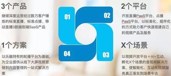 “3”——指的是继续深耕数万企业客户使用的标准直播、标准点播、移动直播3款端到端SaaS产品,持续提供稳定的视频基础服务;