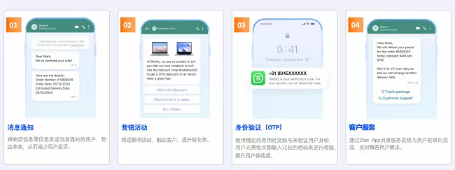 通过Chat App 消息服务,企业可通过 WhatsApp 消息实现多个场景下的用户触达,例如: