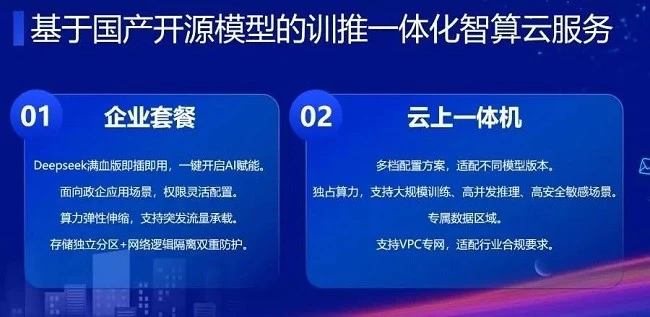 针对政企客户AI部署的多样化需求,双方同步推出“基于国产开源模型的训推一体化智算云服务”,提供企业套餐模式和云上一体机模式两种服务模式。企业套餐模式下,Deepseek满血版即插即用,可一键开启AI赋能,算力弹性可伸缩,突发流量可承载,存储独立分区和网络逻辑隔离,实现数据双重防护。云上一体机模式则具有多档配置方案,适配不同参数模型版本,用户独占算力,VPC专网互通,支持大规模训练、高并发推理、高安全敏感场景,满足合规需求。