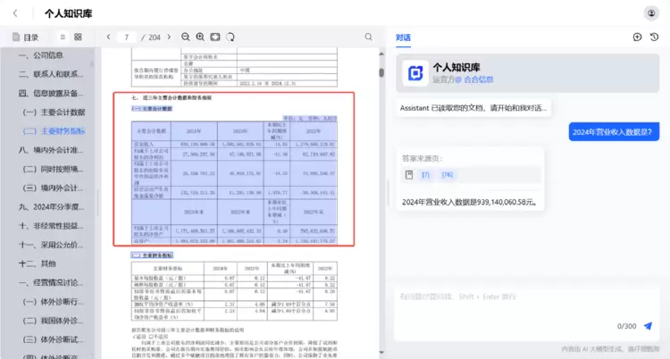 为了让行业“安心”使用大模型,知识库产品推出溯源功能,通过在“投喂”给知识库的Markdown及JSON文件中标记页码、坐标等空间位置信息,实现对句子、段落的精确溯源,为用户提供了一个快速检验的路径。以财务分析为例,大模型在多份高达上千页的财报文件中找到收入、利润等关键数据后,券商分析师可利用溯源功能定位原表格,对信息进行复核,防止错误、遗漏。