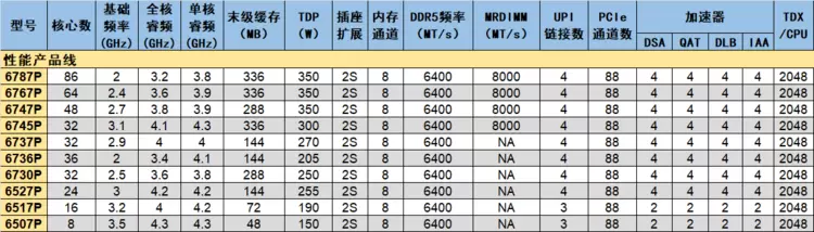 高性能产品线提供了最多86核的型号(6787P),多数型号的加速器全部打开。至强6的每个IO单元提供2个加速器模块,每个模块有DSA、QAT、DLB、IAA各1。两个IO单元就是4种加速器各4个。基于LCC的6517P 和 6507P提供的加速器是各两个。