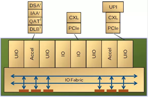 ■ LCC:一个16核心的计算单元和两个IO单元,不支持MRDIMM。使用LCC的处理器UPI链接数只有3,这可能与其计算单元和IO单元之间的EMIB连接较少有关。