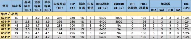 今年2月发布的至强6700/6500系列性能核处理器代号Granite Rapids-SP,集成了8到86个性能核,平均每核分配的末级缓存多数都在4MB以上,完整支持AMX指令集,DSA、QAT、IAA和DLB等加速器也都开启。至强6700/6500性能核处理器使用与至强6700能效核处理器相同的接口和功耗上限,PCIe、CXL扩展能力相同,支持8通道DDR5 6400MT/s,部分型号还提供了MRDIMM 8000MT/s的支持能力。该系列的市场定位更偏向主流的数据中心、电信基础设施,以及企业级服务器和边缘场景。