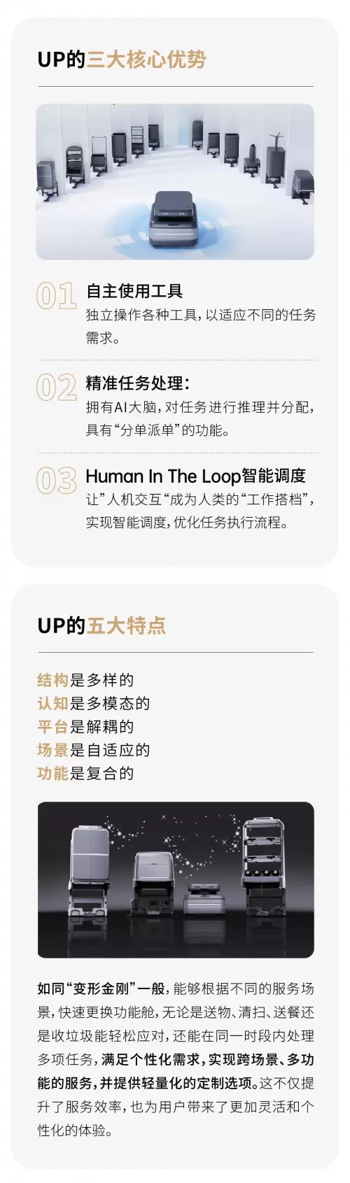 2023年,首创新型服务机器人——复合多态机器人“UP”,作为会使用工具、会理解/推理任务、可群体协作的商用服务机器人。复合多态机器人“UP”联合清华大学教授团队荣获IROS奖项,并凭借在机器人+5G技术的应用,入选工信部首批“综合性5G应用解决方案供应商”。
