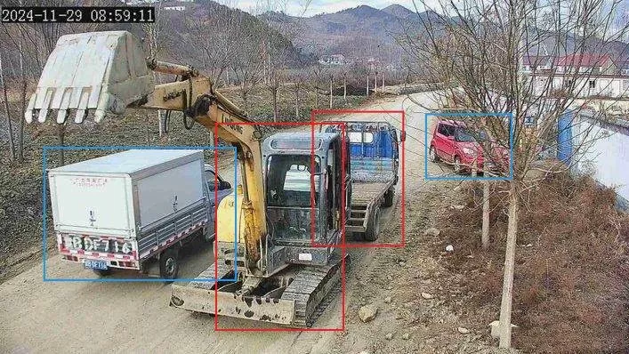 当摄像机触发周界入侵告警后,系统自动对抓拍图片进行二次分析——若仅为人员或非作业车辆,则取消告警;若检测到挖掘机、运煤货车等目标,立即推送至网格化管理系统,并在大数据中心实时展示,确保“不漏一车、不误一人”。