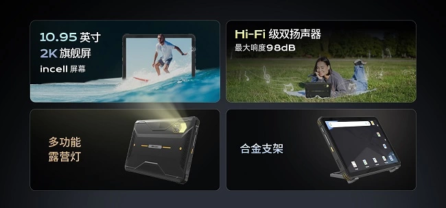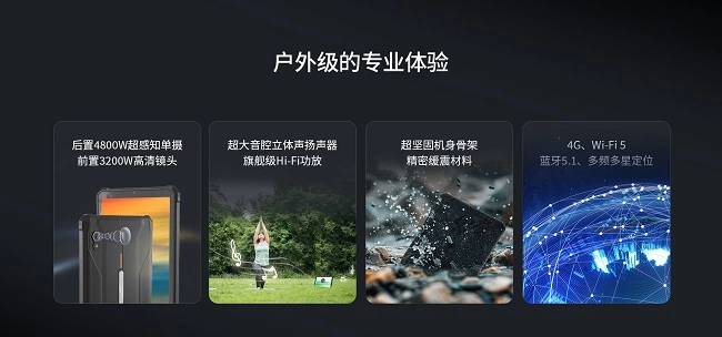 除了性能、电池和影像,户外三防智能平板电脑T2 Ultra还有专业级双扬声器、5G/三频Wi-Fi 6E网络、440流明露营灯、合金支架/绑带配件、IP68防尘抗水&1.22米耐摔等各种户外增强性能和旗舰体验,全方位耐用抗造,特别适合户外重负的工作者和使用者。