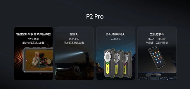 户外三防智能手机P2 Pro的户外功能同样令人印象深刻。它新增了3W大功率、最大响度高达105dB的增强型蜂窝状立体声扬声器,1000流明、照射距离高达50米的露营灯,六种颜色的全新灵感呼吸灯,以及包含指南针、水平仪、气压计、公网对讲等多项实用功能的工具箱软件。这些功能为用户提供了全方位的户外体验,使其成为户外重度爱好者的不二之选。