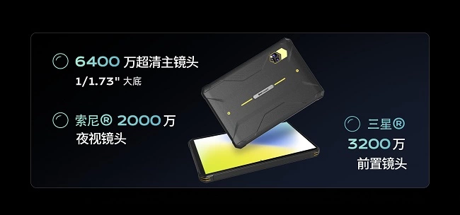 相比T1和T1 MAX,户外三防智能平板电脑T2 Ultra的镜头布局也发生了很大的变化,一颗6400万超清主镜头和一颗3200万三星前置镜头,超大底超高像素优势显著,另外还额外增加了一颗2000万索尼夜视镜头和夜视红外灯,暗光或漆黑场景下也能尽兴一拍,保持了与户外三防手机相当的水平。