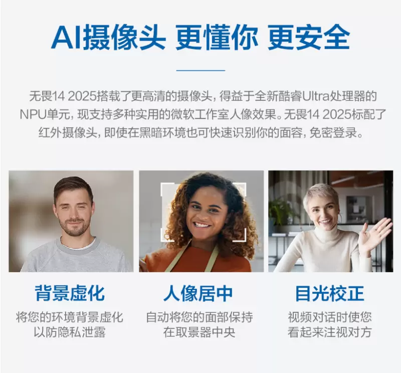 除性能、屏幕方面外,华硕无畏14 2025对于细节的把控也相当出色。得益于高算力的支持,配备的AI摄像头支持背景虚化、人像居中、目光校正等实用的微软工作室人像效果,让用户线上会议、视频交流时能呈现最佳状态。同时还标配红外摄像头,开盖解锁登录一气呵成,既便捷,更安全;配备的ErgoSense人体工学键盘拥有1.7mm长键程、0.2mm下凹弧面键帽以及19.05mm全尺寸间距,码字舒适安静;轻约1.4kg,薄至1.69cm的机身设计,可轻松放入背包或手提包内,实现轻便出行,并且还通过了严苛品质测试,无惧日常磕碰。接口方面,提供两个全功能USB-C 3.2、两个USB-A 3.2、一个HDMI 接口以及3.5mm音频接口,满足多种外接设备需求。
