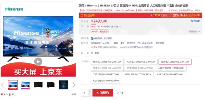 目前这款海信H55E3A 55英寸智能电视正在京东预售,13日0-2点仅需2299元抢购,有需要的朋友可以关注一下。