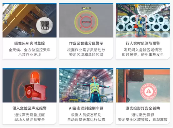 方案支持360°全方位捕捉天车运行过程中的动态信息,消除监控盲区,可根据危险程度划分警示区域,增强警示效果,确保作业安全。
