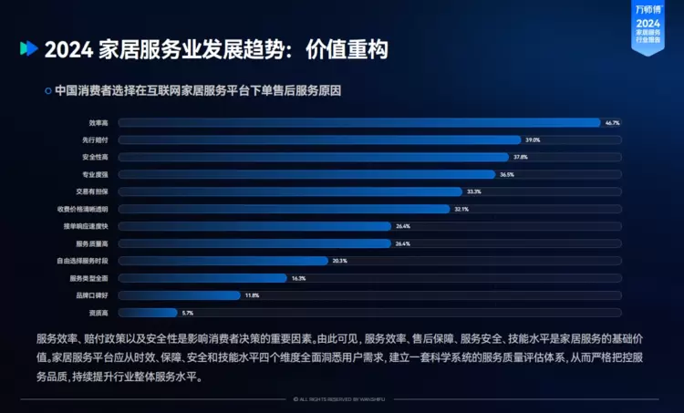 报告显示,效率高、先行赔付、安全性高、专业性强是中国消费者选择线上下单家居服务的主要原因。而用户评价及品牌口碑是用户选择平台的重要决策要素,其次是服务覆盖率和服务价格。