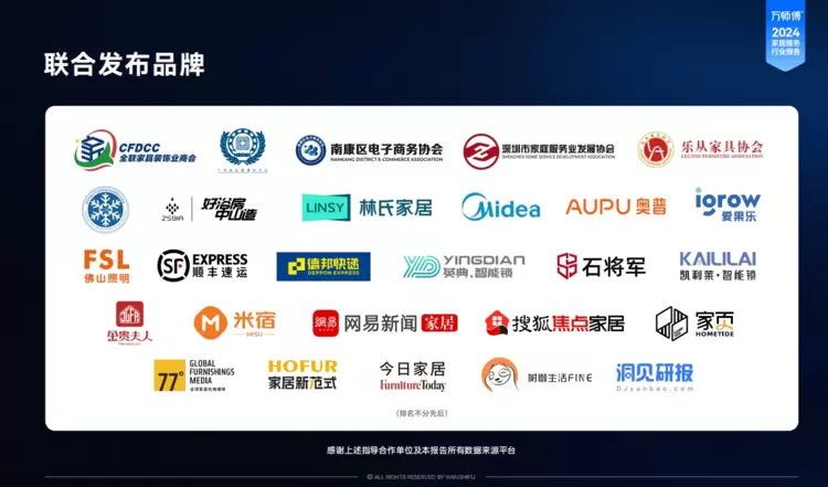 据悉,该报告由全国工商联家具装饰业商会指导,万师傅出品,广东省家居建材商会、佛山乐从家具协会、中山市淋浴房行业协会、南康电子商务协会、深圳市家庭服务业发展协会、深圳市制冷与空调设备安装维修行业协会等单位鼎力支持,顺丰速运、德邦快递、林氏家居、爱果乐、AUPU奥普、美的、佛山照明、石将军、英典、凯利莱、米宿、金贵夫人等行业龙头品牌,网易家居、搜狐焦点家居、家居新范式、今日家居、77度等知名媒体,树懒生活、洞见研报等权威机构联合发布。