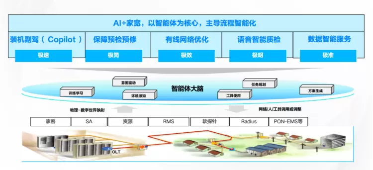 装机副驾方面,协助一线装维人员快速完成现场施工和验收工作、缩短施工时长;预检预修方面,将准确定位报障工单、自动修复、降低上门率;AI语言智能质检方面,将升级语音质检能力,拓展到全工单智能质检;有线网络优化方面,将主动识别质差根因并自动处理、减少用户投诉;数据服务方面,将实现极简化问数、取数、图表统计分析等多维能力。