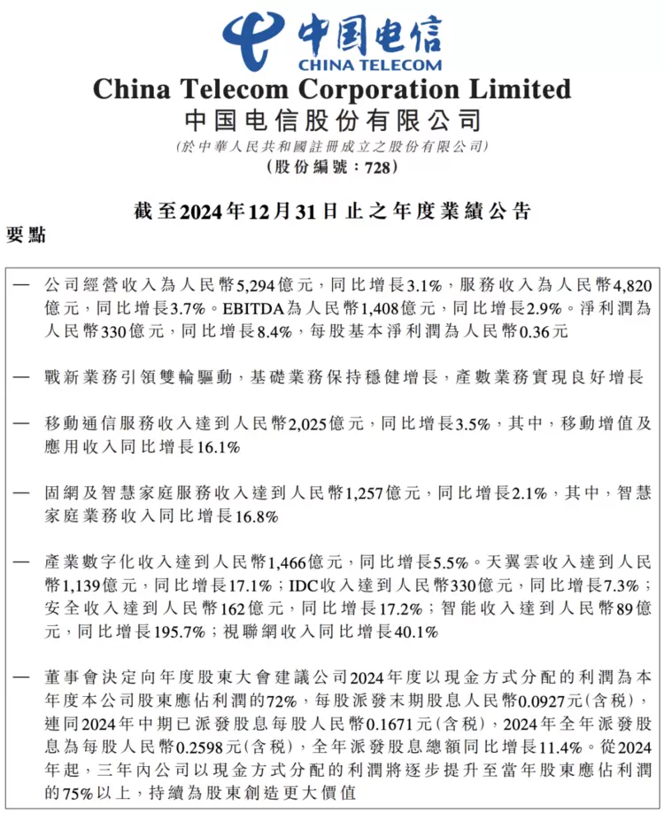 中国电信2024年营收5294亿元:净利润330亿元,同比增长8.4%