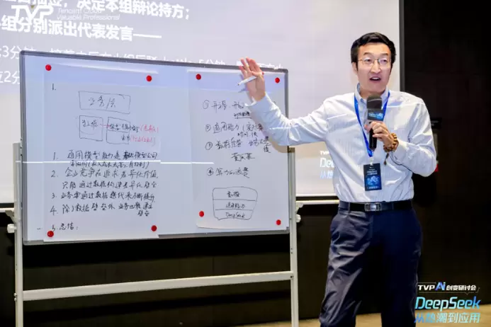 TVP AI 创变研讨会以注重交流互动为特色,特别设计开放式的头脑风暴环节作为本次活动的压轴部分。在这一环节中,数十位 AI 专家被分为十个小组,围绕主持人鲍捷提出的五个关于DeepSeek 的热点问题展开讨论。每相邻的两个小组聚焦同一话题,分别从正反两方的角度深入探讨PK,激发思维碰撞。各小组代表随后进行总结发言,分享讨论成果。现场气氛热烈,专家们见解独到、妙语连珠,为AI创新带来新的灵感与思路。