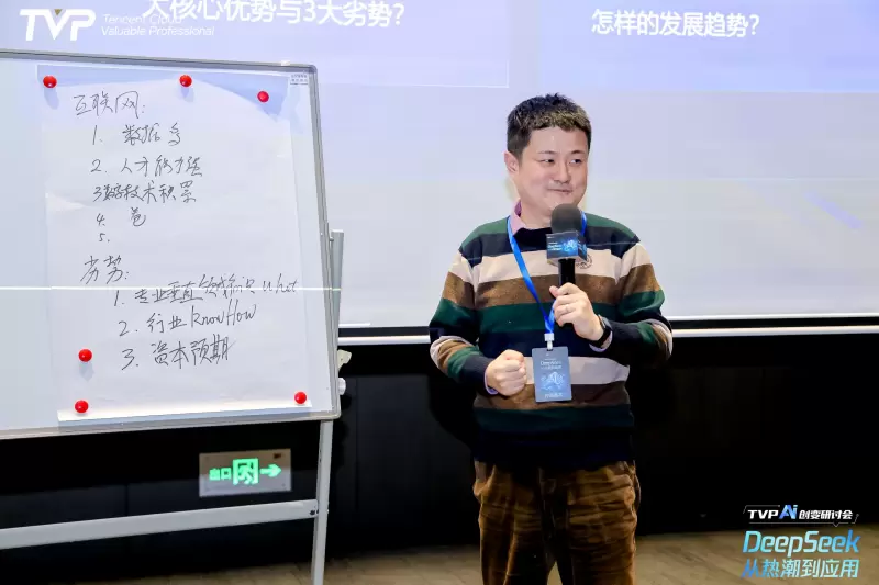 智鹤科技首席科学家、腾讯云 TVP王晔代表发言,他们选择了互联网行业作为研究对象,特别是像腾讯这样的企业,具有以下显著优势:第一,互联网行业的数据量最大且增量持续,远超传统行业,这使得其在AI应用上更具潜力,能基于DeepSeek不断训练出更强大的模型。第二,互联网行业汇聚大量顶尖人才,随着DeepSeek的发展,人才的价值被进一步放大。第三,互联网公司在数字技术积累方面更为深厚,最大化发挥大模型的商业价值。然而,互联网行业也存在劣势,由于它太通用了,在垂直领域缺乏数据壁垒,这反而促使它们通过激烈的竞争来弥补不足。互联网公司面临资本市场压力,可能会影响其长期战略方向,不像 DeepSeek 那样能在无资本压力下专注于学术研究和追求 AGI 成就。