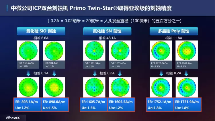 中微公司首创了单反应台可以分别独立操作也可以同时操作的双反应台刻蚀反应器,是占地面积小、输出量高和成本低的刻蚀机。CCP和ICP的双台机已经证明了可以覆盖60%以上的刻蚀应用。大量的生产线数据表明,双反应台和单反应台刻蚀机呈现一样的刻蚀性能、刻蚀稳定性和可靠性。凭借行业首创的可独立工作的刻蚀设备双台机技术,通过超过20年的技术创新与经验积累,中微公司研发的电感耦合ICP刻蚀设备Primo Twin-Star®首次取得了0.2A的业界首创的刻蚀精度。该产品采用独创的低电容耦合LCC 3D线圈设计,双反应台腔体结构并结合创新的反应腔设计,可最大程度减弱非中心对称抽气口效应,可选多区温控静电吸盘(ESC)增强了对关键尺寸均匀性的控制,与其它同类设备相比,具有低成本、占地小和高产出的优异于特性,可应用于大多数先进逻辑和存储器的刻蚀制程。