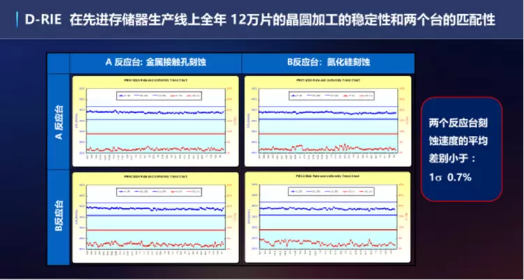 在两个反应台各轮流加工1000片的重复性测试中,两个反应台的平均刻蚀速度相差,只有每分钟9埃,小于1.0纳米(图3)。在海外先进存储器生产线上,全年加工的12万片晶圆的全过程中,两个反应台在两个刻蚀应用上刻蚀速度的差别1sigma小于0.7%(图4)。