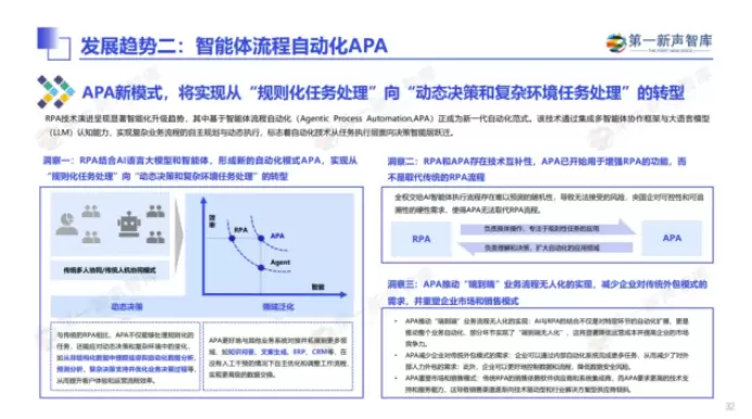 根据第一新声智库判断,未来,超80%央国企对RPA结合AI技术持积极态度,并对其前景保持期待。APA新模式,将实现从“规则化任务处理”向“动态决策和复杂环境任务处理”的转型。