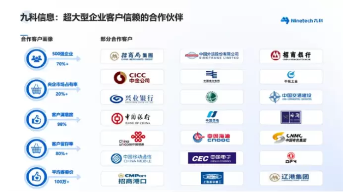 目前九科信息已通过招商局集团、中国交建、南方电网、中国有色集团、中国海油、中国移动、中国联通、振华重工等百家大型国央企的复杂场景验证,在央企客户市场渗透率超过20%,客户复购率超80%,九科团队平均人效100万+,且保持着120%+的年收入增长率。