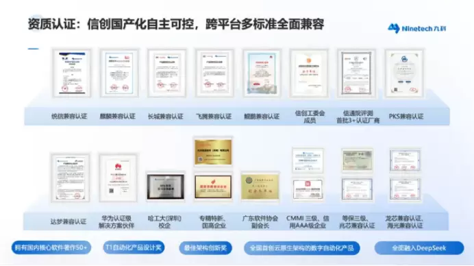 九科信息已被评为国家高新技术企业、专精特新企业,并积累了近60项软著专利。产品已获得信通院首批3+级认证,兼容全套信创环境,并已通过PKS、麒麟、飞腾、长城、鲲鹏、龙芯、兆芯、统信、WPS、华为云等多家信创权威厂商产品兼容性认证。九科信息也是自动化领域唯一的信创工委会成员单位。