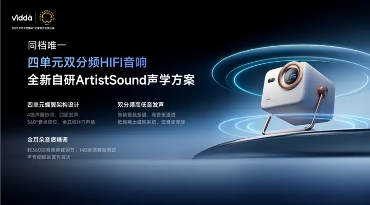 很多人可能觉得投影仪的音质一般般,但Vidda M2 Pro这次可是采用自研的ArtistSound声学方案,四个扬声器高低频分别发声,提供360°声场包围。看电影的时候,声音就像从四面八方包围着你,立体声效果特别强。