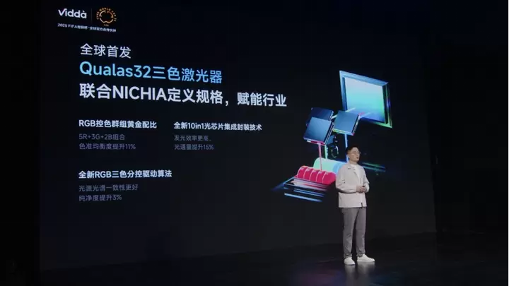 Vidda M2 Pro在画质方面可谓是下足了功夫,搭载全球首发的Qualas 32激光器,色彩均衡性提升了11%,亮度输出能力提升了15%,光色纯净度提升了3%,更是首次将单Qualas激光器投影的实看亮度提高到1000lm以上,达到1200lm/CVIA实看亮度,在同档产品中名列前茅。