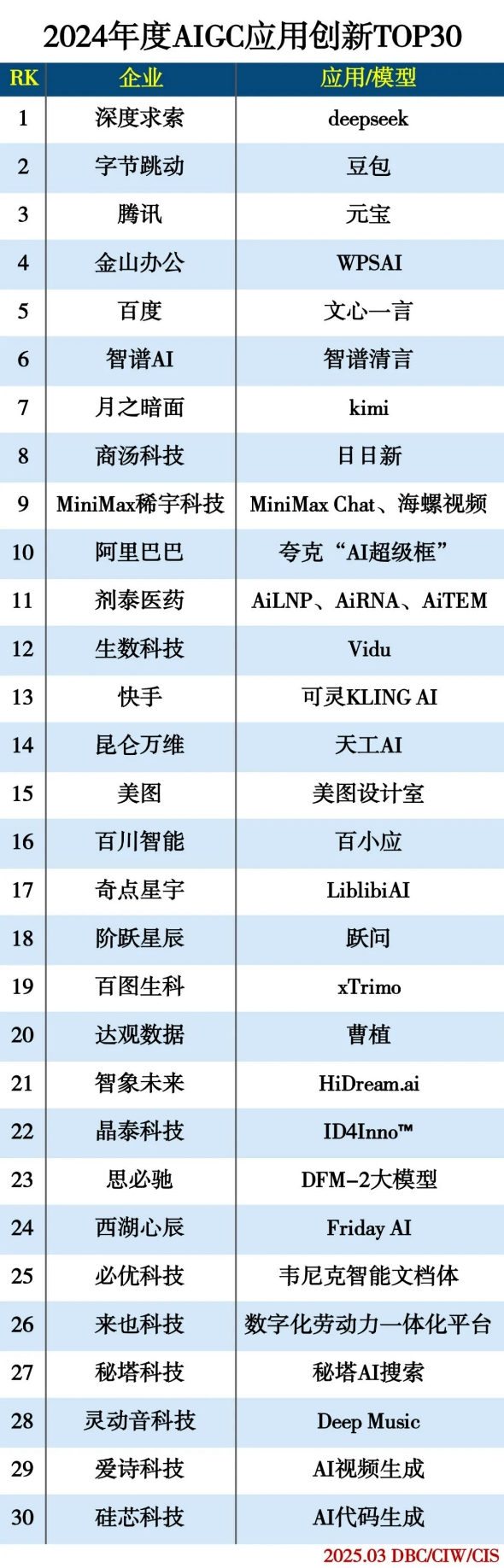 2024年度AIGC应用创新TOP30公布:DeepSeek、美图设计室上榜