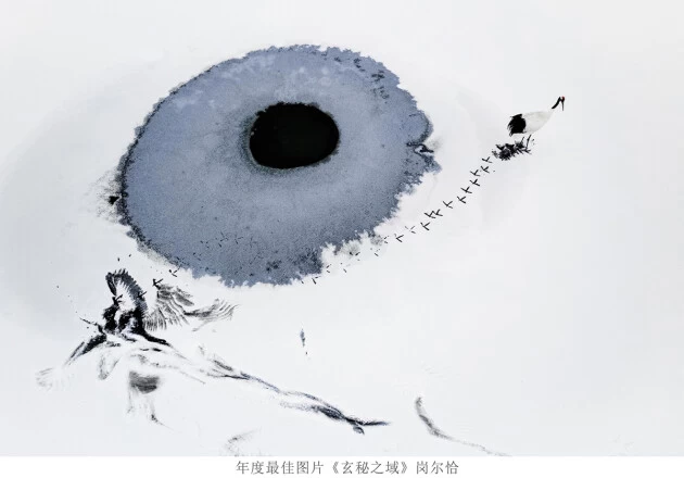 年度最佳图片《玄秘之域》巧妙地在动静之间展现了自然的野性与艺术的美感。摄影师岗尔恰用镜头捕捉到了一只丹顶鹤在小雪覆盖的冰面上落地时不慎摔倒的瞬间,其动作在冰面上画出了一道形似凤凰的拖影。画面中的暗泉为画面增添了东方水墨的意境,使得这一瞬间既充满了戏剧性,又不失自然之美。