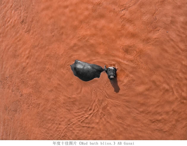 年度十佳图片《Mud bath bliss.》在印度乡村拍摄到了水牛用泥浴来抵御炎热的闲适场景。在摄影师 AB Gusai 的镜头中,水牛眼睛半闭,满足地叹着气,在凉爽湿润的泥浆怀抱中怡然自得。旅行冒险摄影师,评委 Luke Stackpoole 评价道:“鲜艳的红棕色水面与动物的深色身体形成强烈对比,简洁的画面和反向空间的利用将视线直接引导到动物身上,增添了戏剧性和个性。”这幅作品为我们展示了生活中的简单乐趣,以及自然生物在适应环境时的旺盛生命力。