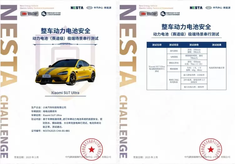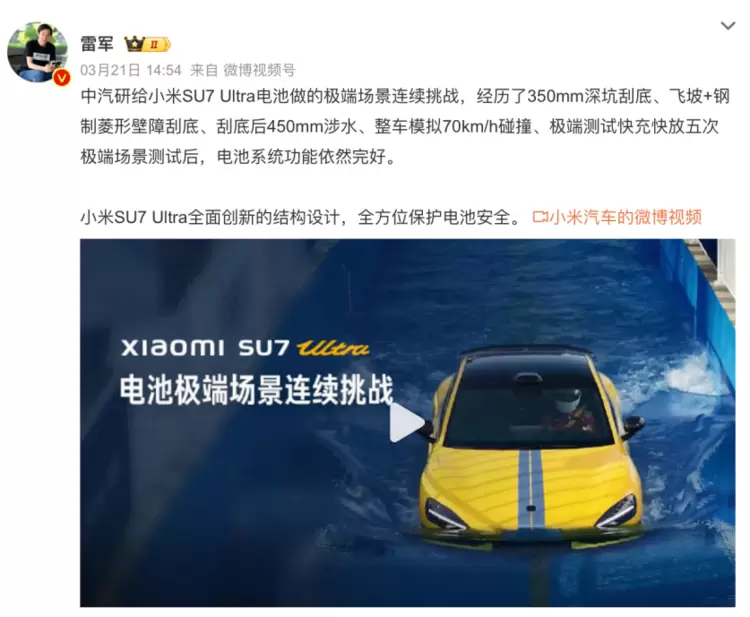 小米SU7 Ultra通过中汽研地狱级测试 麒麟电池“性能激进、安全保守”