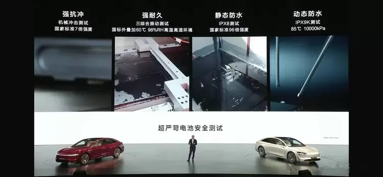 麒麟电池具备最高等级的防水能力。IPX等级评估电气设备防水等级的标准,数字越大表示其防护越佳,静态防水IPX8和动态防水IPX9K都是最高等级。麒麟电池具备最高等级的防水能力,所以能在中汽研测试中450毫米涉水轻松通过。