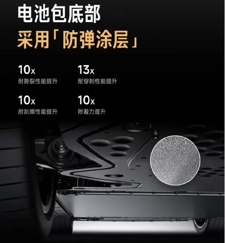 小米SU7 Ultra的麒麟II电池底部采用了“防弹涂层”。这种类似坦克装甲级防护的涂层,能够有效地抵御托底等事故中异物冲击、剐蹭对电芯造成的损伤。与传统PVC涂层相比,“防弹涂层”在多个关键性能上实现了大幅提升,耐撕裂性能提升10倍,耐穿刺性能提升13倍,耐刮擦性能提升10倍,附着力(耐腐蚀)也提升10倍。这一涂层就像是给电池底部穿上了一件超级防护服,大大增强了电池在恶劣工况下的生存能力。