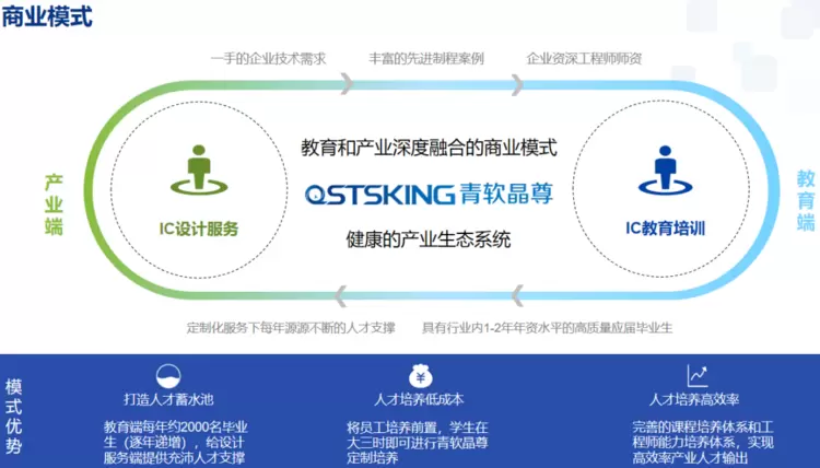 教育培训业务始于2006年,利用平台+内容+服务的模式助力高校集成电路人才培养,一方面将产业端的新技术、新工艺、新需求经过研发转化,为教育端提供符合当下技术发展的教育培养体系,协助高校提升教育服务产业能力;另一方面将教育端培养的高质量人才源源不断的输送到产业,从而解决产业端用人问题,降低用人成本。