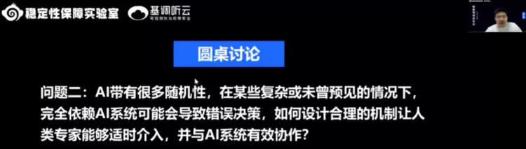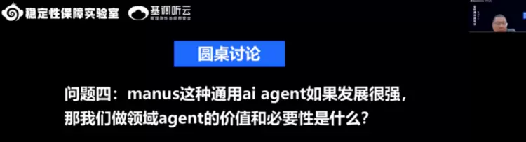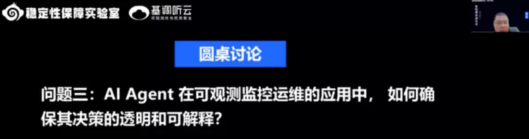 在圆桌环节,基调听云AI负责人韦远奎与各位与会嘉宾现场一起连线对话,同频探讨 AI 大模型和可观测性技术的发展脉络与趋势,嘉宾们针对大模型对于运维的将本增效、人类专家与AI系统的有效协作、AI Agent决策的可解释性、通用Agent对于领域Agent的影响等议题,进行了热烈的探讨与交流。