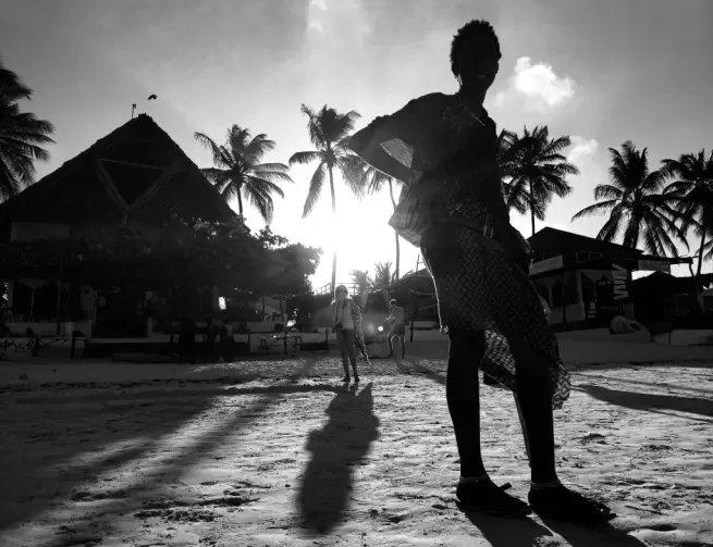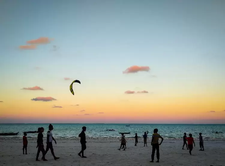 日落时分是桑给巴尔岛最有活力的时候。红日降落在一团棉絮之上,棉絮突然着了火,火势蔓延,点燃了整个天空。此时,沙滩上的人们,即使是在逆光的情况下,也能清洗可见空中的滑翔伞的细节。这样超强大的宽容度相信即使是单反相机来拍摄,也只能开启RAW无损格式,否则这样的宽容度很难能够做到。