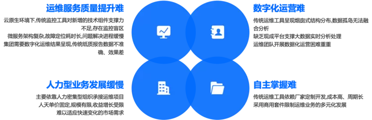 在当前运维现状下,联投湖北数产集团在楚天云、国资云承接的众多应用系统面临着系统架构复杂、技术栈多样、服务调用关系繁琐等挑战。云原生技术的引入进一步加大运维难度,且现有的运维团队专业技术人才储备有限,缺乏一体化、集约化运维手段,运维压力增加,难以满足未来架构扩展带来的技术挑战。同时,集团对应用系统的高质量体验提出更高要求,使得运维工作面临新的机遇和挑战: