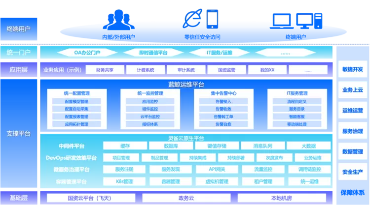 业务管理一体化平台集IT服务台、统一配置管理、监控告警、自动化运维等多种功能于一体,通过统一的平台,运维团队能更为高效地管理运维任务,减少信息孤岛,提高协作效率。平台支持自动化运维工具和运维开发框架,实现日常运维任务自动化,减少人工干预,提升运维效率与准确性。平台具备灵活性和扩展性,支持新信创环境,且能通过API网关,无缝对接国资云、政务云、容器云及本地设备,确保功能模块间有效协作,推动运维场景融合。